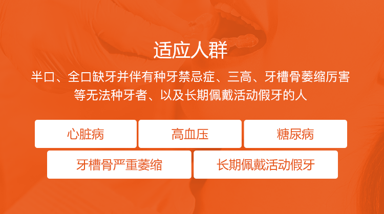 患者有比较严重的全身的系统性疾病,而且全身系统性疾病控制情况比较差的,比如严重的高血压、心脏病、糖尿病,是不适合做种植牙的;从患者的口腔局部环境条件来讲,如果种植牙的部位或者口腔的局部有不受控制的或者尚未控制的一些急性炎症,牙槽骨严重萎缩且身体虚弱人群也不适合做种植牙。对于这类缺牙人群来说,活动义齿是更适合的修复方式。