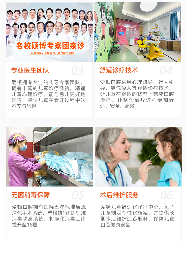爱顿口腔集团“罗慕儿牙早矫”以16岁以下儿童为服务对象,集口腔疾病宣传、预防、保健、治疗为一体,可满足各个年龄段儿童的各项牙齿保健和治疗需求。同时,为了让儿童摆脱看牙恐惧,实现轻松看牙,爱顿口腔在高端诊疗设备的引导下,结合舒适诊疗技术,高质、高效地解决儿童口腔内的所有问题。同时贴心的服务、温馨的环境、童趣的布局、专业的团队、舒适的诊疗能够有效缓解儿童就医紧张、情绪不安等现象,让孩子在愉悦的心境下接受口腔治疗,看牙不留阴影。